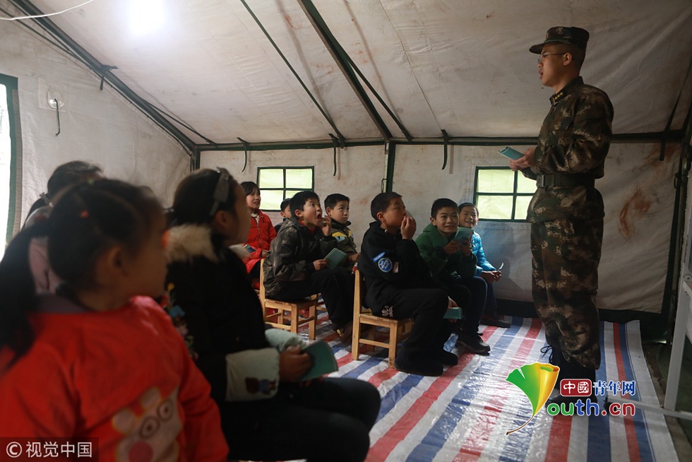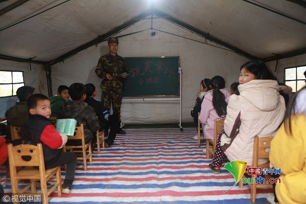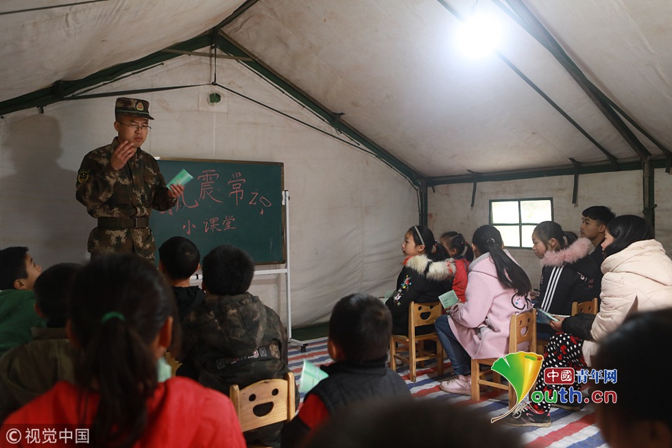 2018年12月18日,四川宜賓。武警宜賓支隊(duì)政治工作處宣傳保衛(wèi)股股長(zhǎng)朵祝偉為周家鎮(zhèn)新塘安置點(diǎn)的“帳篷學(xué)?!钡膶W(xué)生上抗震常識(shí)課。圖片作者:謝江、劉崇達(dá)/視覺(jué)中國(guó)