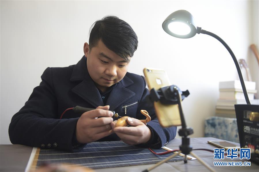 12月18日,劉征在自己的加工坊里通過(guò)手機(jī)直播展示葫蘆創(chuàng)作技藝。 新華社記者 魯鵬 攝
