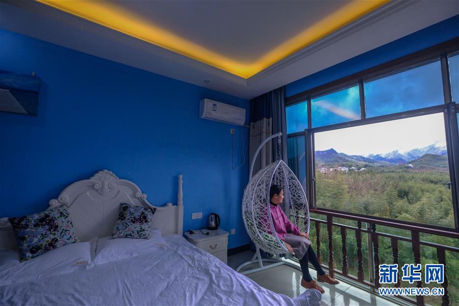 游客在河橋鎮(zhèn)一家名為“柳棲民宿”的房間里欣賞室外的風(fēng)景(12月6日攝)。該民宿的主人是一名回鄉(xiāng)創(chuàng)業(yè)的青年。