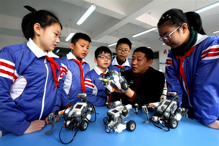 12月19日,武安市淑村鎮(zhèn)白沙學(xué)校的老師給學(xué)生們講解機器人組裝知識。 新華社記者王曉攝