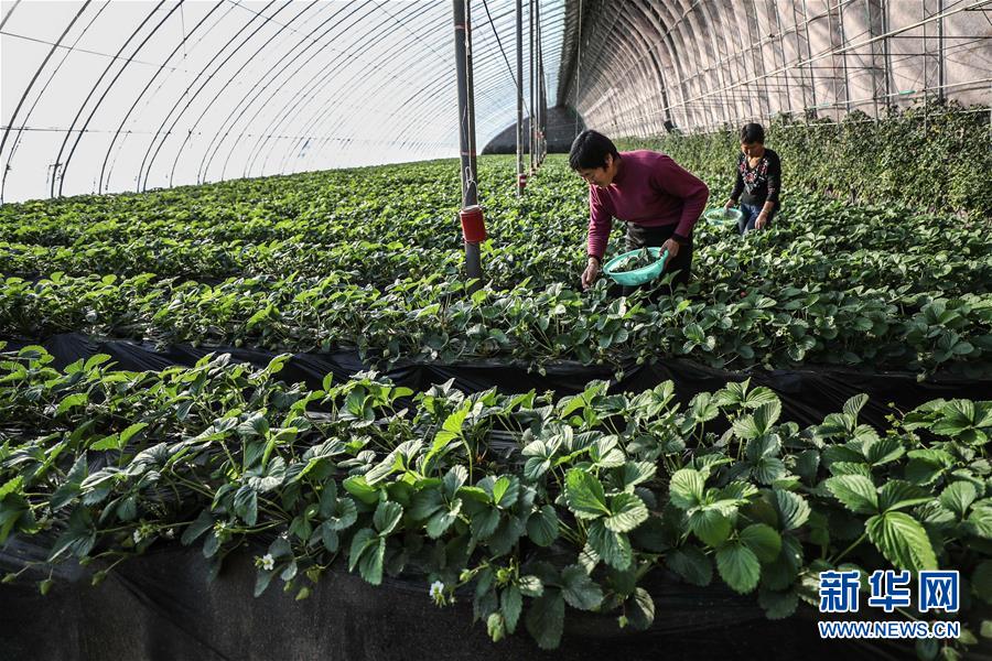 12月19日,農(nóng)戶在大棚里管理草莓。 2017年5月,遼寧省鐵嶺市昌圖縣大四家子鎮(zhèn)方家船口村利用土地確權(quán)成果,由村兩委班子成員領(lǐng)辦創(chuàng)辦了昌圖久晟果木蔬菜種植專業(yè)合作社。到2018年9月,合作社利用產(chǎn)業(yè)扶貧資金、壯大村集體經(jīng)濟(jì)扶持資金、村集體用地和村民入股資金建成了11個“股份制大棚”,主要種植草莓等作物,產(chǎn)品通過電商銷往云南、四川、北京、上海等地,預(yù)計第一期可為265名貧困戶每人分紅860元。 新華社記者潘昱龍攝