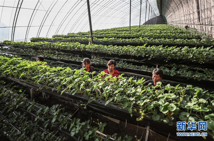 12月19日,農(nóng)戶在大棚里管理草莓。 2017年5月,遼寧省鐵嶺市昌圖縣大四家子鎮(zhèn)方家船口村利用土地確權(quán)成果,由村兩委班子成員領(lǐng)辦創(chuàng)辦了昌圖久晟果木蔬菜種植專業(yè)合作社。到2018年9月,合作社利用產(chǎn)業(yè)扶貧資金、壯大村集體經(jīng)濟扶持資金、村集體用地和村民入股資金建成了11個“股份制大棚”,主要種植草莓等作物,產(chǎn)品通過電商銷往云南、四川、北京、上海等地,預(yù)計第一期可為265名貧困戶每人分紅860元。 新華社記者潘昱龍攝