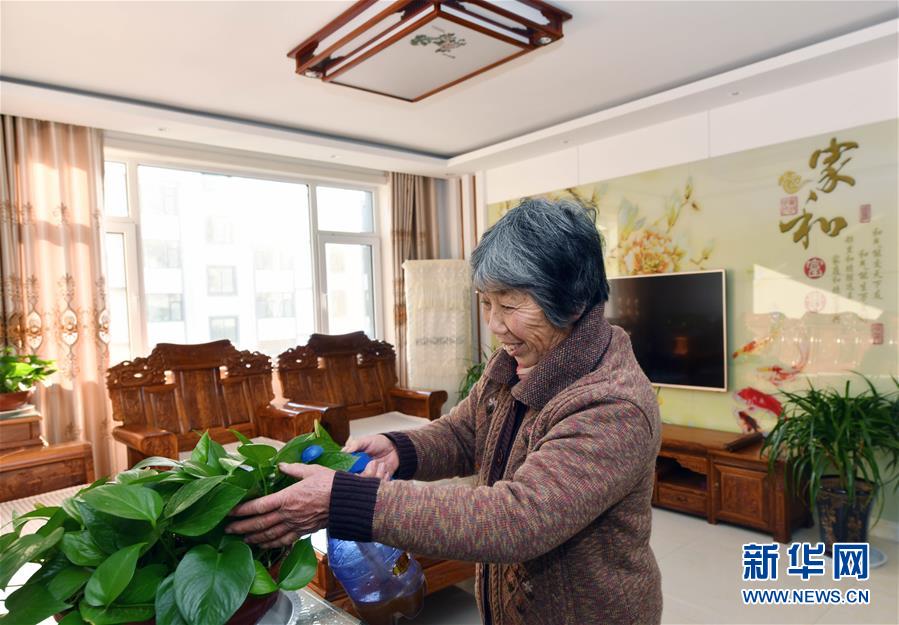 12月20日,青城鎮(zhèn)游家村村民薛繼榮在青平社區(qū)新居內澆花。 新華社記者 朱崢攝