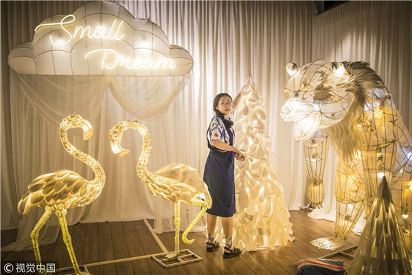 2018年5月6日,廣州,在天河區(qū)一家大商場(chǎng)辦個(gè)展時(shí),用紙片做成的北極熊、大松樹、火烈鳥、紙房子在光線的配合下美輪美奐,吸引了很多顧客駐足?!皫缀趺總€(gè)人一看到,都會(huì)走進(jìn)那個(gè)夢(mèng)幻的場(chǎng)景里,和這些紙雕一起合影?!眻D片攝于2018年5月6日。南塘/視覺中國(guó)