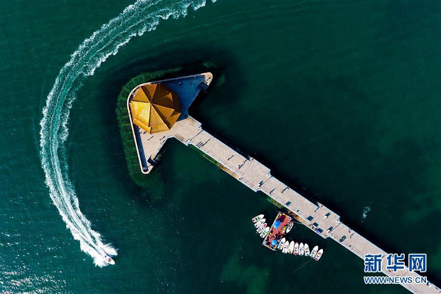 一艘游艇駛過山東青島棧橋旁的海面(5月4日無人機拍攝)。 在即將過去的2018年,各地攝影師用鏡頭記錄下四季中國。大江南北,一幅幅色彩斑斕的美麗畫卷徐徐展開。 新華社記者 郭緒雷 攝