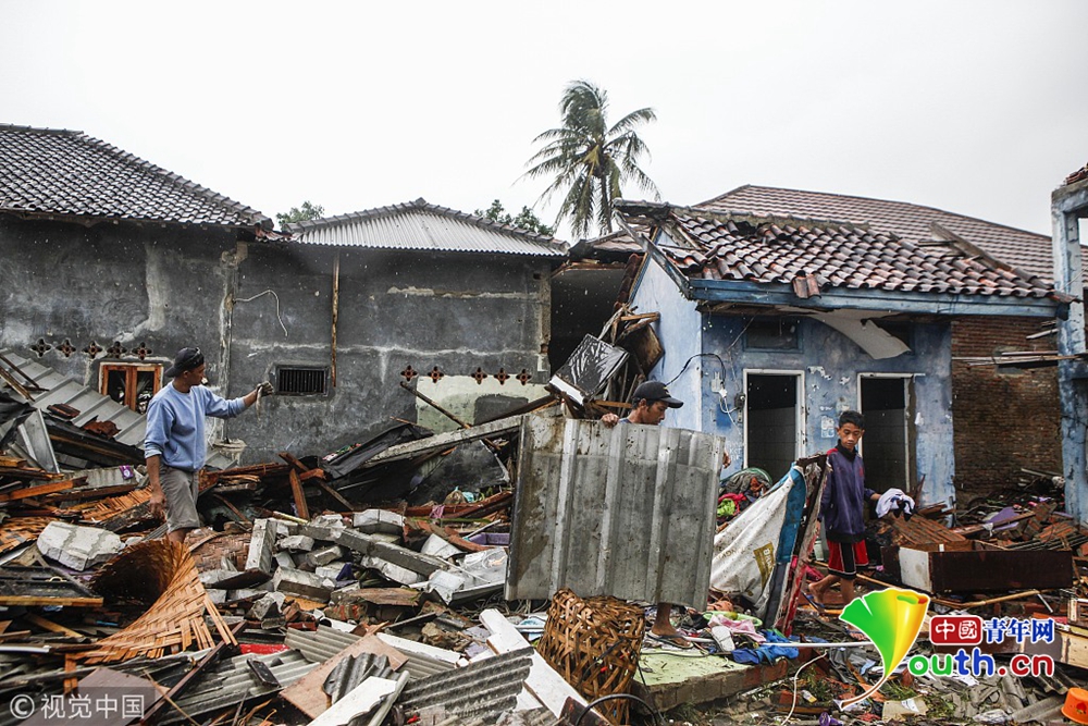 12月24日,受災(zāi)民眾在印尼萬(wàn)丹省海嘯災(zāi)區(qū)進(jìn)行清理工作。 印度尼西亞抗災(zāi)署發(fā)言人24日說(shuō),印尼西部巽他海峽海嘯死亡人數(shù)已經(jīng)上升至373人。 新華社記者 張可任 攝