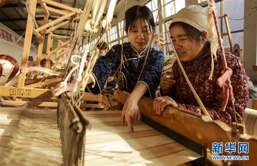 12月25日,在衡水市冀州區(qū)一家老粗布生產(chǎn)企業(yè),田園棉手織粗布傳承人(左)在指導(dǎo)村民織布。 2018年以來,河北省衡水市冀州區(qū)依托當(dāng)?shù)氐氖〖壏沁z田園棉手織粗布技藝資源,采取“非遺+扶貧”的模式,通過非遺傳承人開展技能培訓(xùn)、老師傅傳幫帶等,讓貧困村民在傳承非遺文化的同時(shí)學(xué)習(xí)傳統(tǒng)技藝,助力脫貧致富。 新華社記者 李曉果 攝