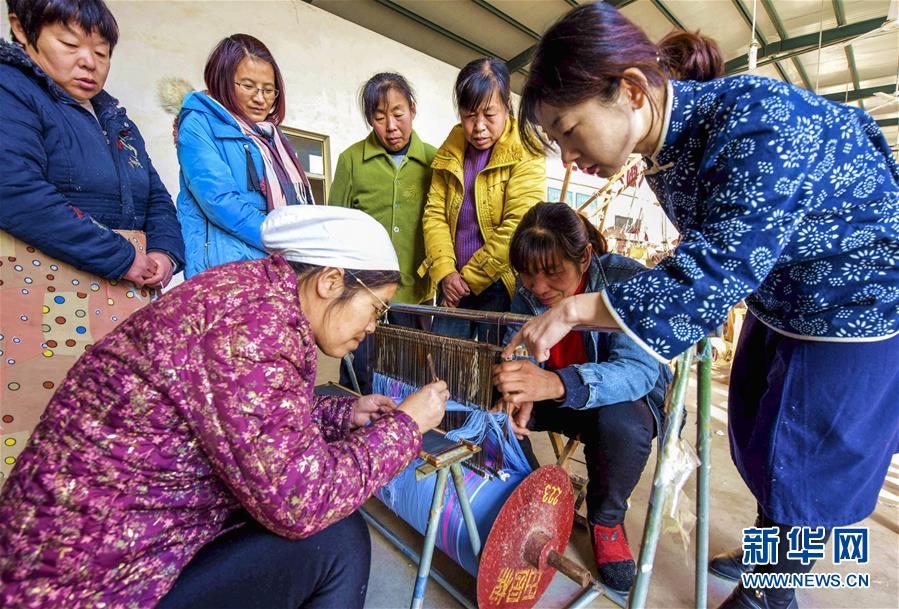 12月25日,在衡水市冀州區(qū)一家老粗布生產(chǎn)企業(yè),田園棉手織粗布傳承人(右一)在指導(dǎo)村民學(xué)習(xí)田園棉手織粗布技藝。 2018年以來,河北省衡水市冀州區(qū)依托當(dāng)?shù)氐氖〖壏沁z田園棉手織粗布技藝資源,采取“非遺+扶貧”的模式,通過非遺傳承人開展技能培訓(xùn)、老師傅傳幫帶等,讓貧困村民在傳承非遺文化的同時(shí)學(xué)習(xí)傳統(tǒng)技藝,助力脫貧致富。 新華社記者 李曉果 攝