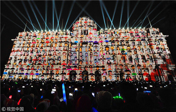 2017年12月31日跨年夜,南京,大報(bào)恩寺遺址公園內(nèi)的大報(bào)恩塔塔身投影出“你好2018”的字樣,眾多市民前來(lái)撞鐘,為家人和朋友祈福,迎接新年。