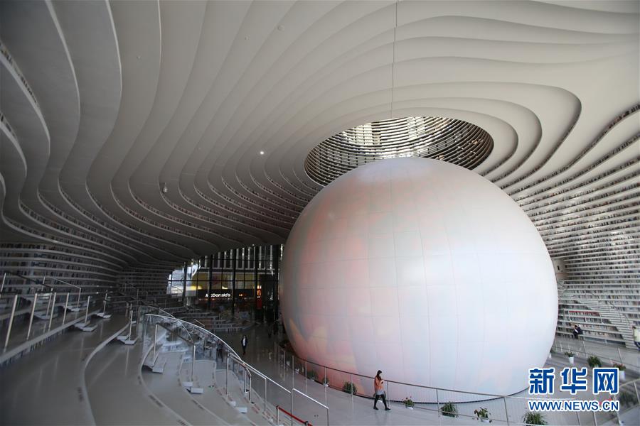 12月27日,讀者參觀天津?yàn)I海新區(qū)圖書館中庭。 濱海新區(qū)圖書館位于天津?yàn)I海文化中心,2017年10月1日正式開館,設(shè)計(jì)立意為“濱海之眼”和“書山有路勤為徑”。圖書館現(xiàn)有藏書60多萬冊(cè),一年多來接待讀者約280萬人次,已成為濱海新區(qū)的文化“新地標(biāo)”。 新華社記者段卓力攝
