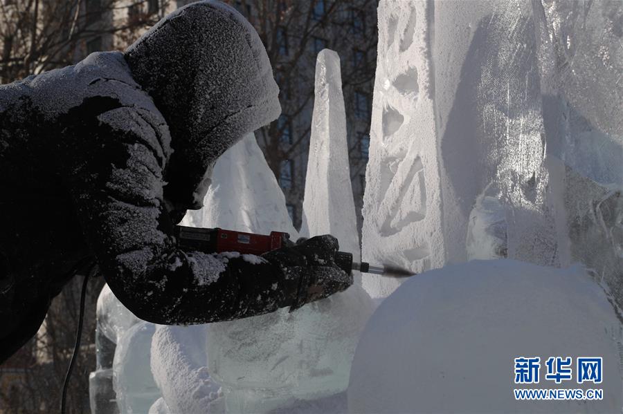 12月27日,來自東北石油大學的選手在比賽中完善冰雕作品。 當日,第十六屆黑龍江省大學生冰雕藝術設計創(chuàng)作大賽在哈爾濱兆麟公園落下帷幕,全省高校共有99支隊伍參賽。 新華社記者曹霽陽攝