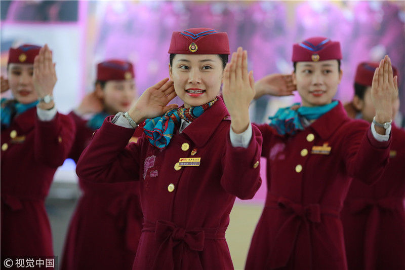 2018年12月27日,四川成都,為備戰(zhàn)即將開通的成雅鐵路,中國鐵路成都局集團(tuán)有限公司成都客運(yùn)段動(dòng)車二隊(duì)對(duì)成雅動(dòng)車的乘務(wù)人員進(jìn)行理論、形體、服務(wù)禮儀等內(nèi)容的培訓(xùn)。