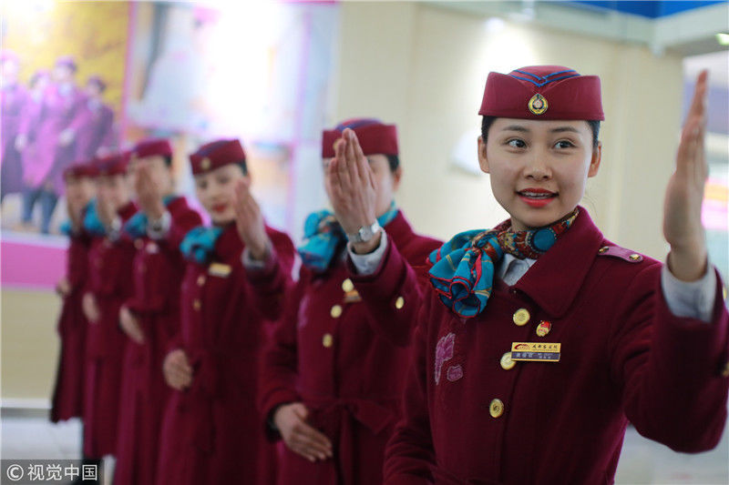 2018年12月27日,四川成都,為備戰(zhàn)即將開通的成雅鐵路,中國鐵路成都局集團(tuán)有限公司成都客運(yùn)段動車二隊(duì)對成雅動車的乘務(wù)人員進(jìn)行理論、形體、服務(wù)禮儀等內(nèi)容的培訓(xùn)。