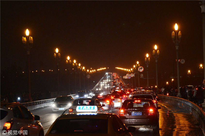 2018年12月13日,江蘇南京,“一橋飛架南北,天塹變通途?!弊鳛槲覈谝蛔孕性O計和建造的雙層鐵路、公路兩用橋,南京長江大橋在我國橋梁史上的重要地位不言而喻。從1968年建成后的48年間,它就如同一條巨龍,始終在長江上默默守護著人來車往。南京長江大橋上層是公路橋,下層為雙軌復線鐵路橋,連接津浦鐵路與滬寧鐵路干線,是我國南北交通要津和命脈。近年來,由于南京長江大橋公路橋的實際通行荷載遠超原先設計標準,不僅橋面上擁堵?,F(xiàn),橋梁本身的種種“病害”也日益加深。圖為2018年12月13日,夜幕降臨,南京長江大橋歸位后的玉蘭花燈重新點亮。大橋玉蘭花燈柱共有299根,每根燈柱上有5盞玉蘭花燈,1大4小,一共1495盞。方東旭/視覺中國