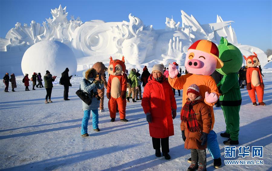 12月29日,在太陽島雪博會(huì)園區(qū),游客在雪雕作品前留影。 當(dāng)日,第31屆哈爾濱太陽島國際雪雕藝術(shù)博覽會(huì)正式開園。本屆太陽島雪博會(huì)以“歡樂雪博會(huì)·夢幻雪域游”為主題,占地90萬平方米,分為五大景區(qū)。 新華社記者 王建威 攝