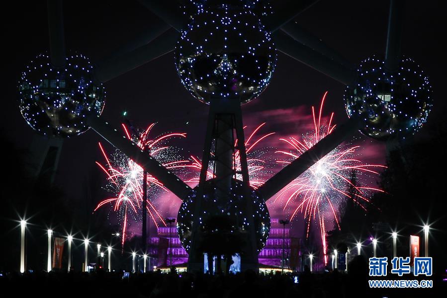 1月1日,比利時首都布魯塞爾的地標性建筑——原子球塔附近煙花綻放。 新華社記者鄭煥松攝