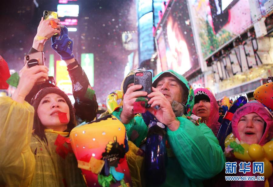 1月1日,在美國(guó)紐約時(shí)報(bào)廣場(chǎng),人們?cè)谟曛袇⒓涌缒昊顒?dòng)。 新華社記者秦朗攝