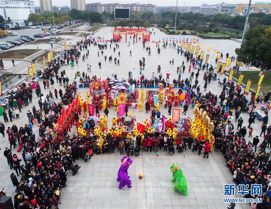 1月1日,演員在展演活動(dòng)上進(jìn)行舞龍舞獅等非遺傳統(tǒng)文化表演(無(wú)人機(jī)拍攝)。2019年元旦,浙江省桐鄉(xiāng)市濮院鎮(zhèn)舉辦新年“非遺文化藝術(shù)節(jié)”活動(dòng),濮院鎮(zhèn)下屬多個(gè)鄉(xiāng)村的傳統(tǒng)美食制作、手工藝品、非遺文化表演等鄉(xiāng)村特色非遺項(xiàng)目在濮院鎮(zhèn)中心廣場(chǎng)進(jìn)行集中展示展演。新華社記者 徐昱 攝