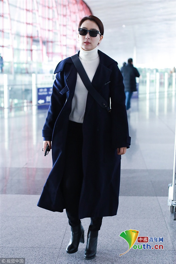 2019年1月7日,北京,馬蘇現(xiàn)身機場。她身穿黑色到腳大衣霸氣外露,架黑超涂紅唇似帥氣“女特工”。