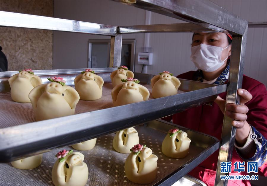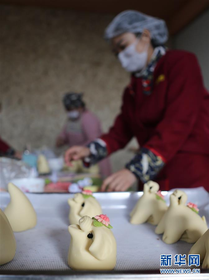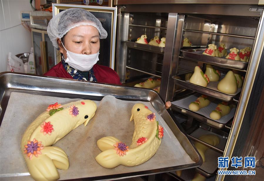1月8日,工作人員準(zhǔn)備將做好的花餑餑放入蒸箱。  新華社記者 李紫恒 攝