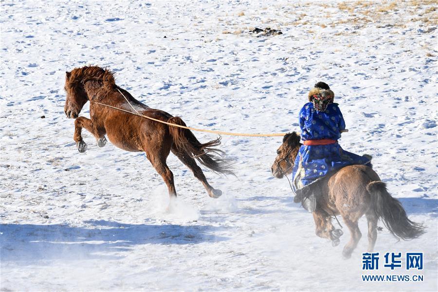 1月8日,牧民在馴服一匹烈馬。 時下正值草原冬季旅游旺季,內(nèi)蒙古自治區(qū)西烏珠穆沁旗的牧民們在雪原上一展身手,為游客展現(xiàn)獨特的民族風情。 新華社記者 鄒予 攝