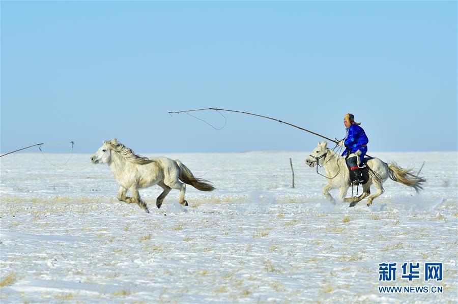 1月8日,牧民進行套馬表演。 時下正值草原冬季旅游旺季,內(nèi)蒙古自治區(qū)西烏珠穆沁旗的牧民們在雪原上一展身手,為游客展現(xiàn)獨特的民族風情。 新華社記者 鄒予 攝