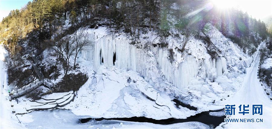 位于吉林省長白縣的十五道溝望天鵝風(fēng)景區(qū),屬長白山余脈。這里生態(tài)原始,古樹參天,瀑飛泉涌,怪石嶙峋,素有“北方九寨溝”的美譽(yù)。 冬日里,在形態(tài)各異的巖墻、巖柱間流淌的溪水因低溫凝固,仿若時間凍結(jié),一切流動的美便以湍急之勢凝于石壁,形成了半冰半水、亦靜亦動的冰瀑景觀,盡顯大自然的鬼斧神工。 新華社記者張楠攝
