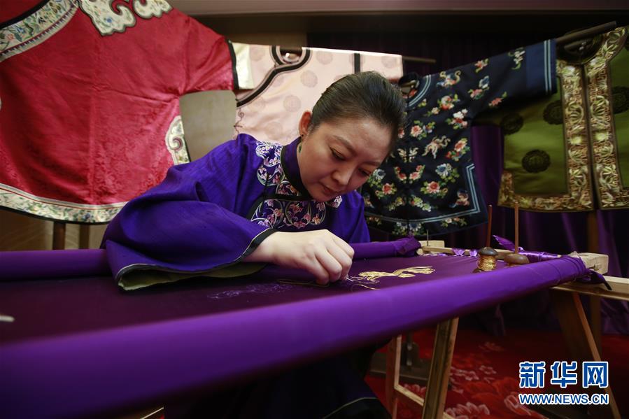 1月12日,在北京“碧泓云想”服裝設(shè)計工作室,高定服裝設(shè)計師畢紅在為中式服裝制作刺繡紋樣。畢紅設(shè)計的中式服裝以棉、麻、真絲等面料為主。春節(jié)來臨,其團隊加班加點為顧客趕制中式服裝。