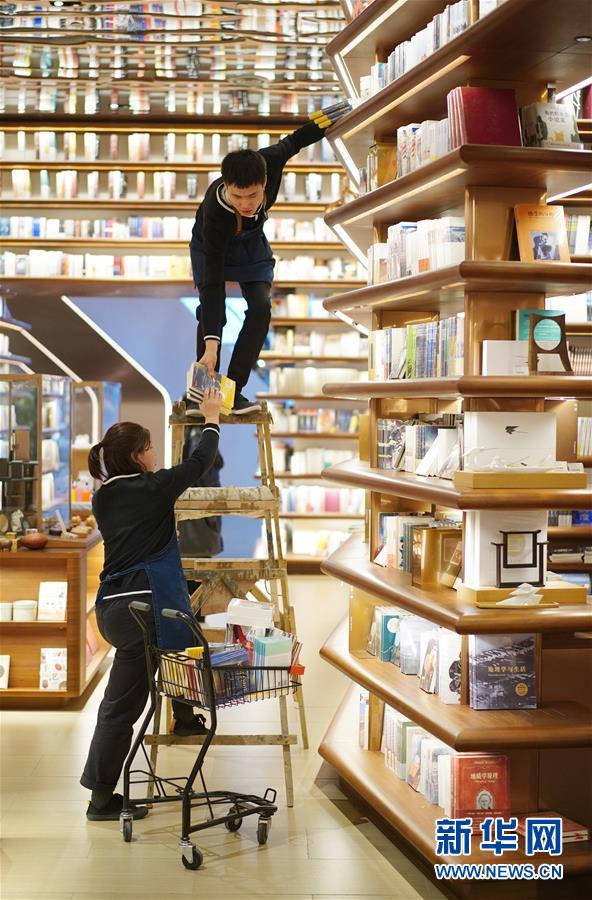 1月14日,西安高新區(qū)一家大型書店的工作人員在店內整理書籍。