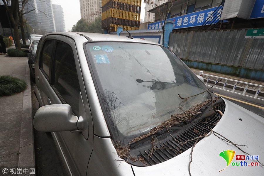 因?yàn)槭敲赓M(fèi)停車位,就成為僵尸車的天堂。粗粗?jǐn)?shù)了一遍,至少有10余輛汽車裹著車衣,被落葉等臟物覆蓋;有的車最后的年檢標(biāo)志是3年前,車胎漏氣,車內(nèi)也是堆著雜物。