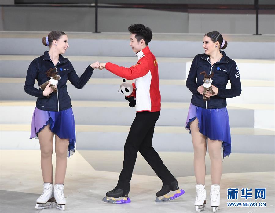 1月15日,中國花樣滑冰選手金博洋(中)與芬蘭運動員交流。 當日,“2019中芬冬季運動年”開幕式在北京首鋼冰球館舉行。 新華社記者申宏攝