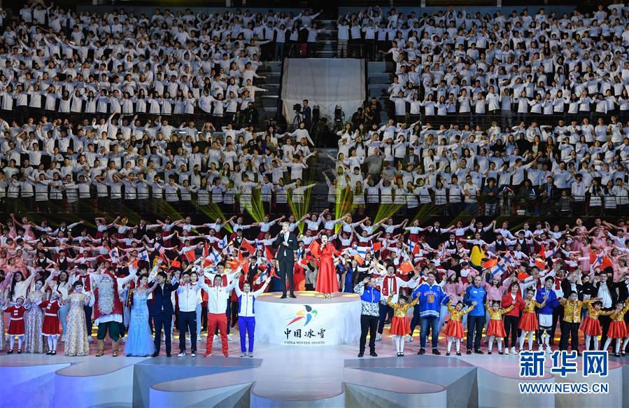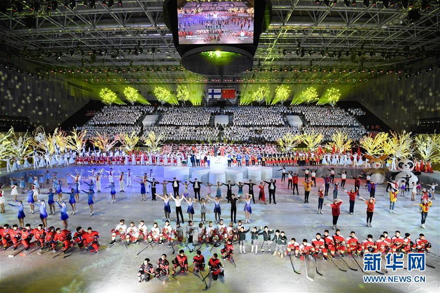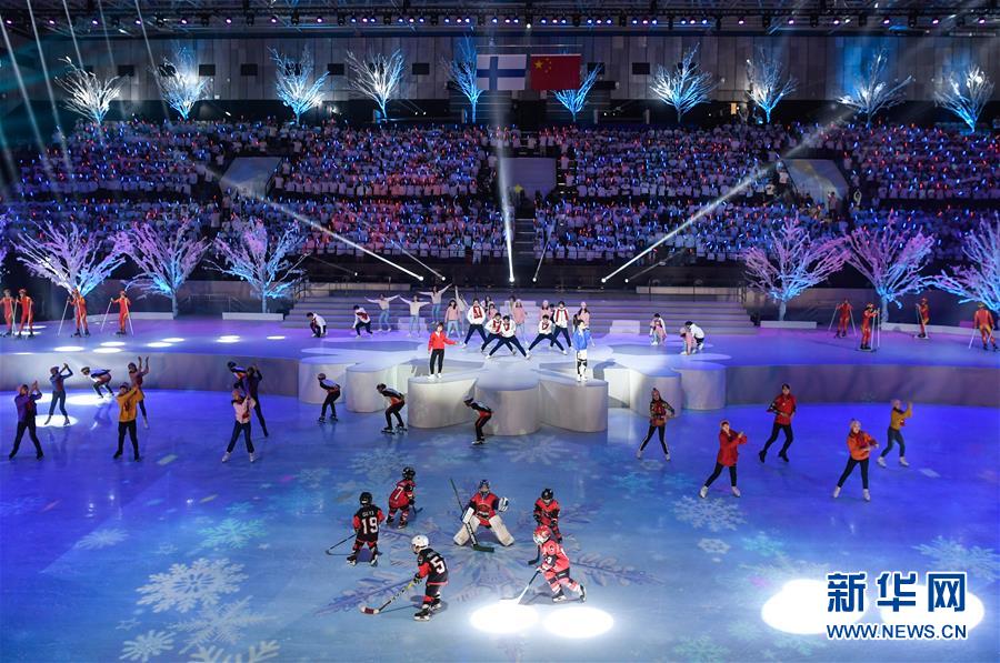 1月15日,演員在開幕式上表演。 當日,“2019中芬冬季運動年”開幕式在北京首鋼冰球館舉行。 新華社記者申宏攝