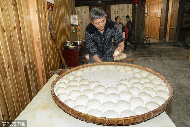 2019年1月26日,重慶中山古鎮(zhèn),880桌“千米長宴”5萬人共品年味。街坊們在頭天就開始準(zhǔn)備各種菜肴與小吃。