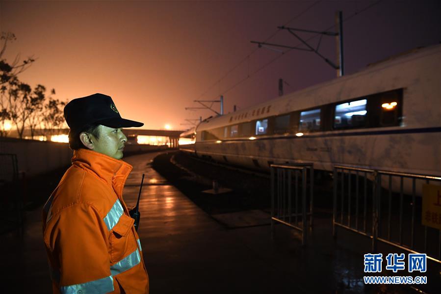 1月29日,王瑞在合肥南動(dòng)車(chē)運(yùn)用所進(jìn)行動(dòng)車(chē)組連掛作業(yè)。新華社記者劉軍喜攝