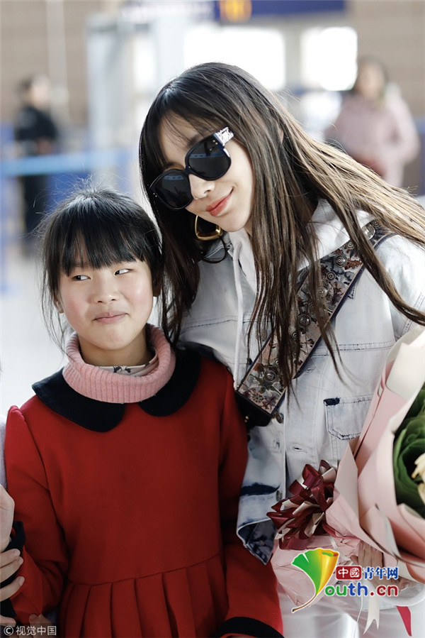 2019年2月24日,上海,楊穎現(xiàn)身機場。她全白套裝現(xiàn)身身材十分纖細,手捧粉絲送的花與小粉絲合影,十分親切。