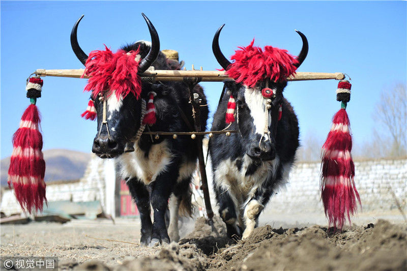 圖為白朗縣洛江鎮(zhèn)村民開耕犁出新年的第一壟青稞田,據(jù)悉,每年開耕節(jié)上,農(nóng)牧民都會(huì)裝扮自家的耕牛。