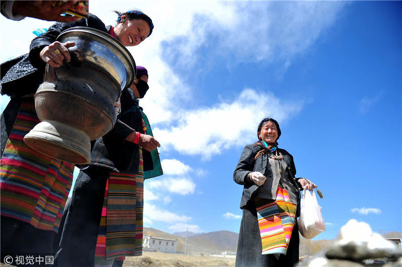 2019年3月16日,西藏各地迎來(lái)開耕節(jié)。位于年楚河畔的日喀則白朗縣被譽(yù)為“后藏糧倉(cāng)”,當(dāng)日,當(dāng)?shù)夭刈遛r(nóng)牧民將家里的耕牛裝扮一新,對(duì)農(nóng)田進(jìn)行開耕,大家齊聚青稞地,慶祝春播開始。圖為白朗縣洛江鎮(zhèn)民眾在青稞地里煨桑煙(一種祈福方式)、敬獻(xiàn)青稞酒,祈福新的一年風(fēng)調(diào)雨順、五谷豐登。 江飛波(西藏分社)/中新社/視覺中國(guó) 編輯/陳進(jìn)