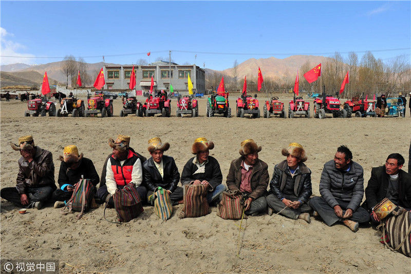 3月16日,山南市乃東區(qū)克松社區(qū)居民在開耕儀式上。 當(dāng)日,西藏各地男女老幼身著節(jié)日盛裝,駕著一輛輛由彩旗、花朵裝扮一新的拖拉機(jī),涌向待墾的農(nóng)田,載歌載舞迎來(lái)一年一度的開耕儀式。 新華社記者 晉美多吉 攝