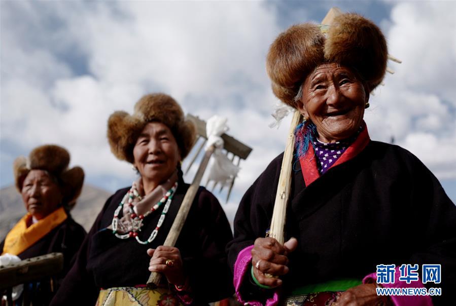 3月16日,山南市乃東區(qū)克松社區(qū)居民在開耕儀式上。 當(dāng)日,西藏各地男女老幼身著節(jié)日盛裝,駕著一輛輛由彩旗、花朵裝扮一新的拖拉機(jī),涌向待墾的農(nóng)田,載歌載舞迎來(lái)一年一度的開耕儀式。 新華社記者 李鑫 攝