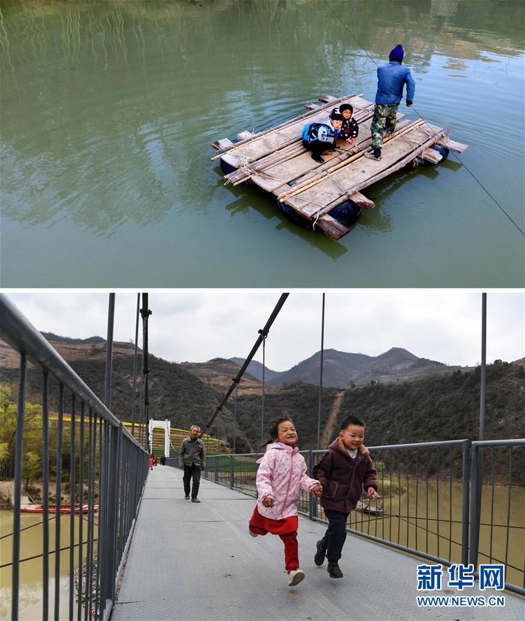 這是一張拼版照片:上圖為略陽(yáng)縣徐家坪鎮(zhèn)藥木院村江口壩組的余皓軒(左)、劉紫涵(中),由余皓軒的外公劉德安撐上簡(jiǎn)易木筏,去對(duì)岸的幼兒園上學(xué)(2018年11月22日無人機(jī)拍攝);下圖為余皓軒(前右)、劉紫涵(前左)放學(xué)歸來,手拉手走在新修的鋼結(jié)構(gòu)吊橋上(2019年3月25日攝)。