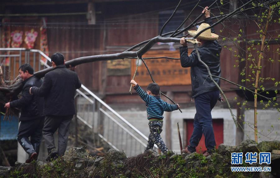 這是黔桂烏英苗寨的群眾在抬樹(shù)苗,準(zhǔn)備用來(lái)美化居住環(huán)境(3月16日攝)。