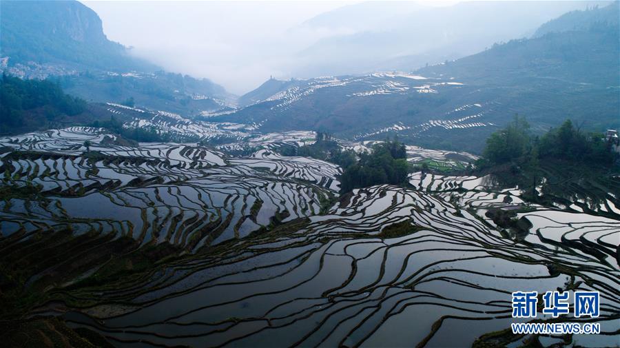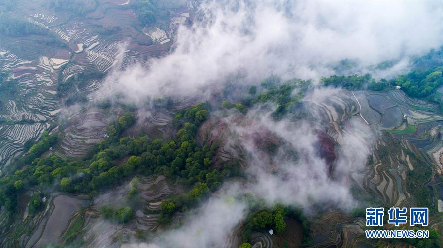 這是在云南省元陽縣拍攝的晨曦中的哈尼梯田美景(4月4日無人機拍攝)。哈尼梯田位于云南省哀牢山南部,以哈尼族為主的當?shù)厝罕娗О倌陙砩幌⒃诖蟮厣稀暗窨獭背鲞@一農(nóng)耕文明奇觀。春日里,漫山的水稻梯田與云海、森林、村莊形成一幅美麗的畫卷,吸引眾多海內(nèi)外游客前來觀賞。新華社記者 胡超 攝