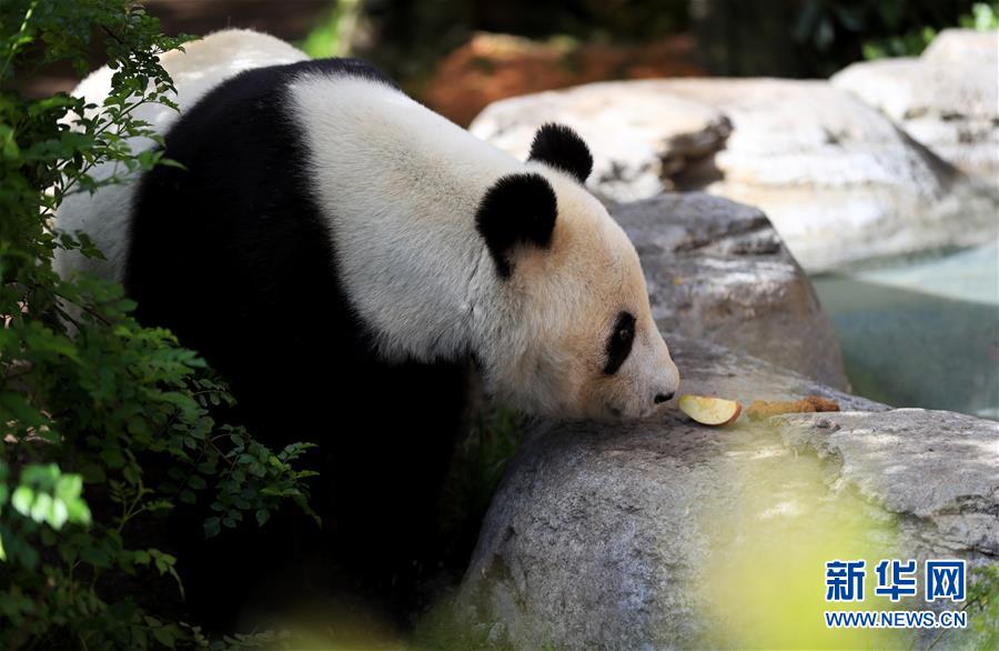 4月6日,在美國圣迭戈動物園熊貓館,大熊貓“白云”在吃水果。新華社記者李穎攝