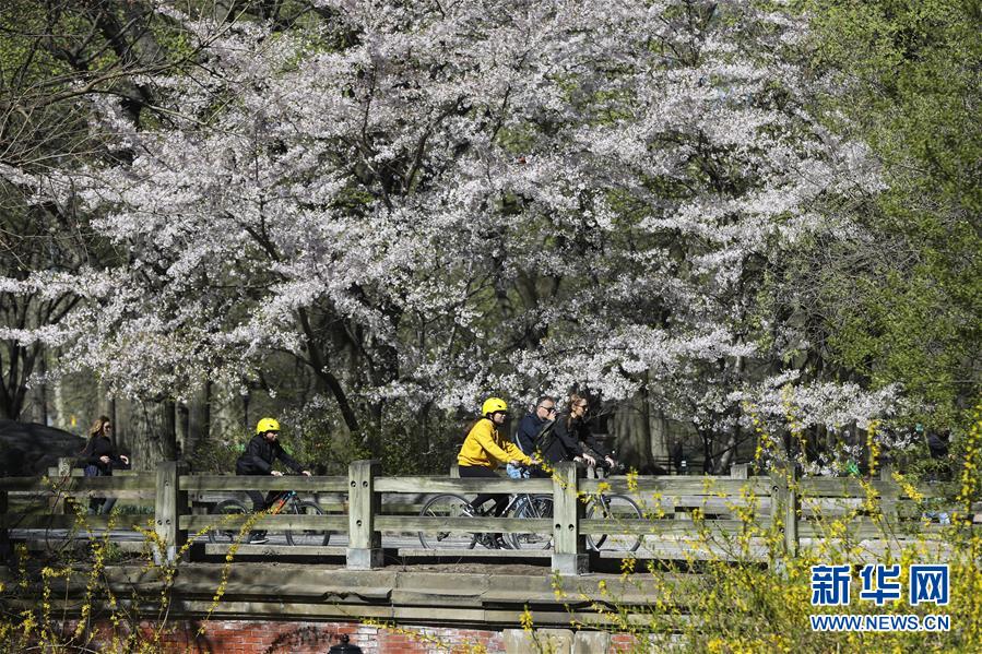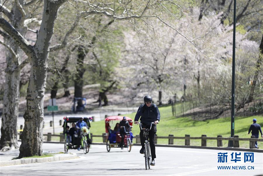 4月16日,人們?cè)诿绹~約中央公園騎行。 新華社記者 王迎 攝
