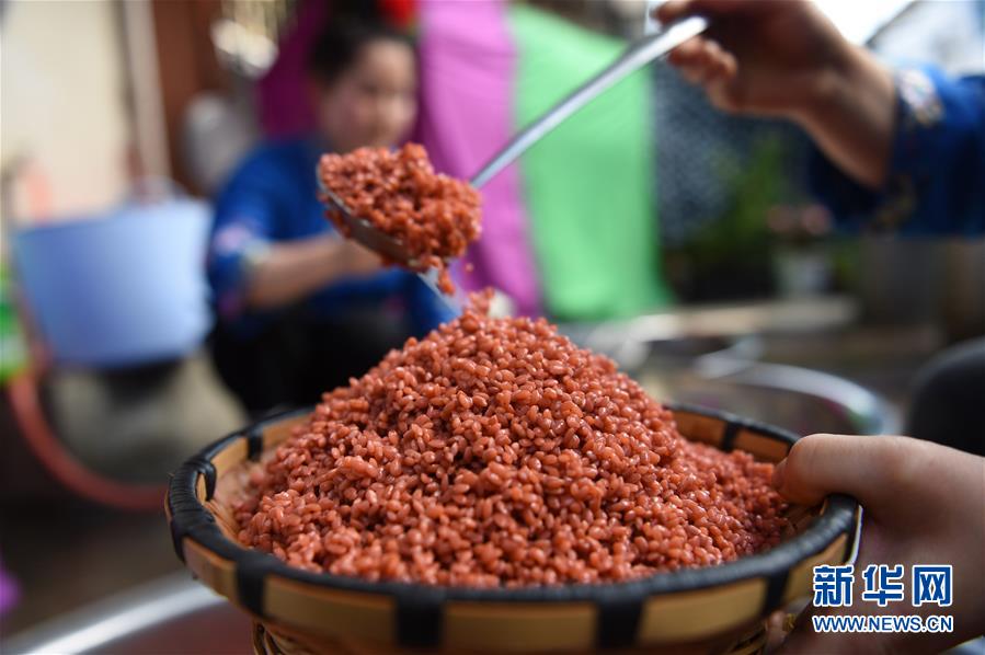 4月16日,在貴州省臺(tái)江縣姊妹街哆蝶五彩姊妹飯?bào)w驗(yàn)店,苗家婦女展示制作五彩“姊妹飯”的糯米。新華社發(fā)(劉開福 攝)
