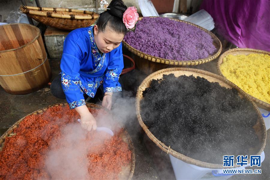4月17日,在貴州省臺(tái)江縣姊妹街哆蝶五彩姊妹飯?bào)w驗(yàn)店,苗家婦女在攤晾五彩“姊妹飯”。新華社記者 楊文斌 攝