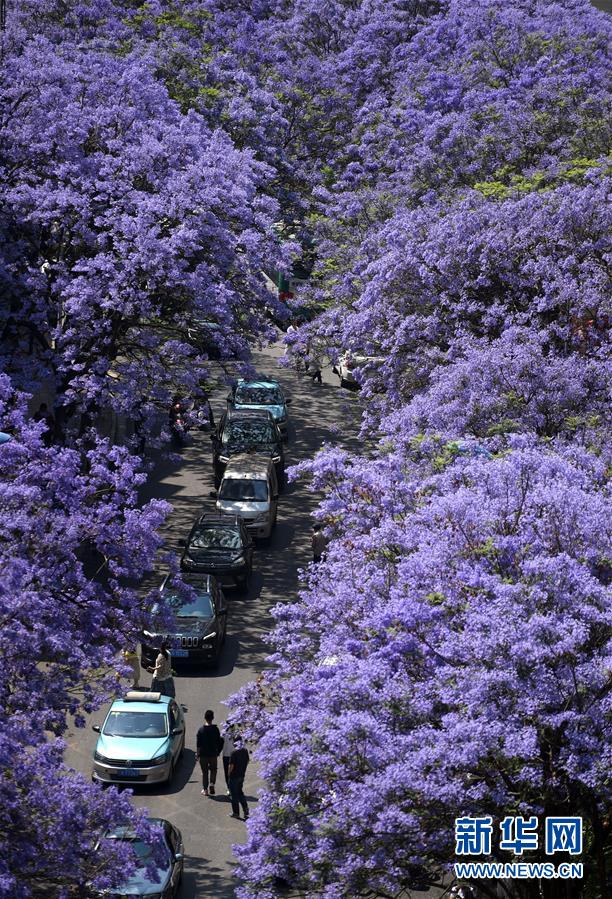 昆明市教場中路一帶的藍花楹進入盛花期(4月24日攝)。近日,云南昆明市不少街區(qū)的藍花楹相繼開放,為美麗春城增添了一處處風(fēng)景。 新華社記者秦晴攝