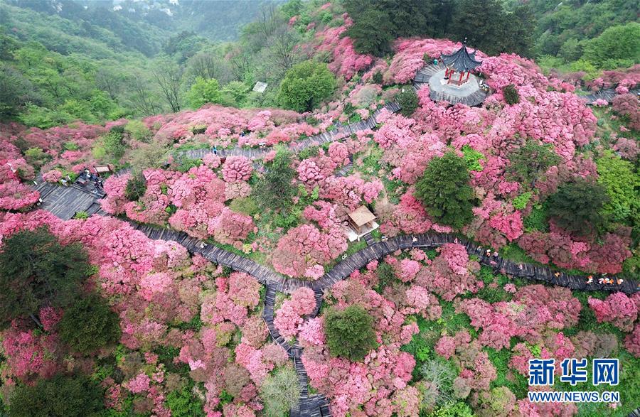 4月25日,游客在龜峰山杜鵑花海中游玩(無人機(jī)拍攝)。 近日,湖北省麻城市龜峰山的10萬畝古杜鵑盛開,大量游客前來賞花觀景。 新華社記者 程敏 攝
