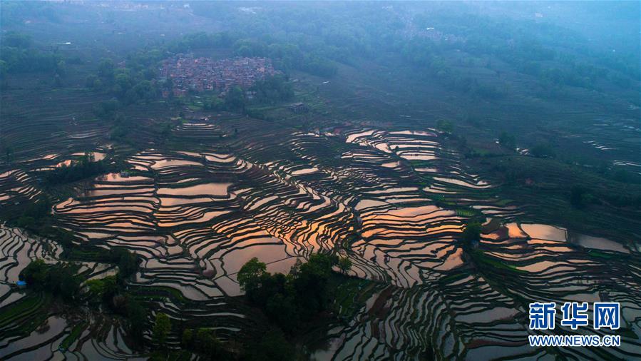 這是在云南省元陽(yáng)縣拍攝的傍晚時(shí)分的哈尼梯田美景(4月3日無(wú)人機(jī)拍攝)。 新華社記者 胡超 攝