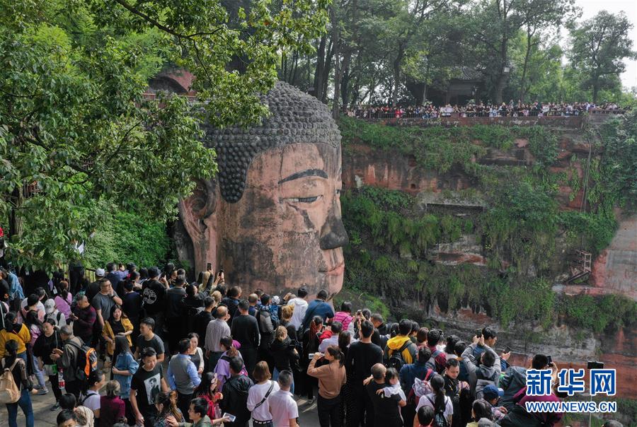 10月4日,游客在樂山大佛景區(qū)的棧道上有序排隊(duì),一睹大佛真容。 新華社記者 江宏景 攝